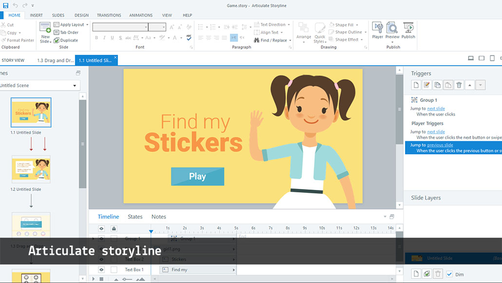 This project is a prototype of a matching game built using Articulate Storyline. It is a story of Anna, who loves to collect stickers. The player goal is to help her find the missing stickers and add them to her book. The instructions and the story supposed to be narrated by Anna during the gameplay. Also, another goal of for this game is to introduce the names of the animals to children, once the image dragged over, Anna would say the name of the animal in that image. Currently, this prototype has no audio, and the instructions were printed on the screen to demonstrate what the protagonist is supposed to say.