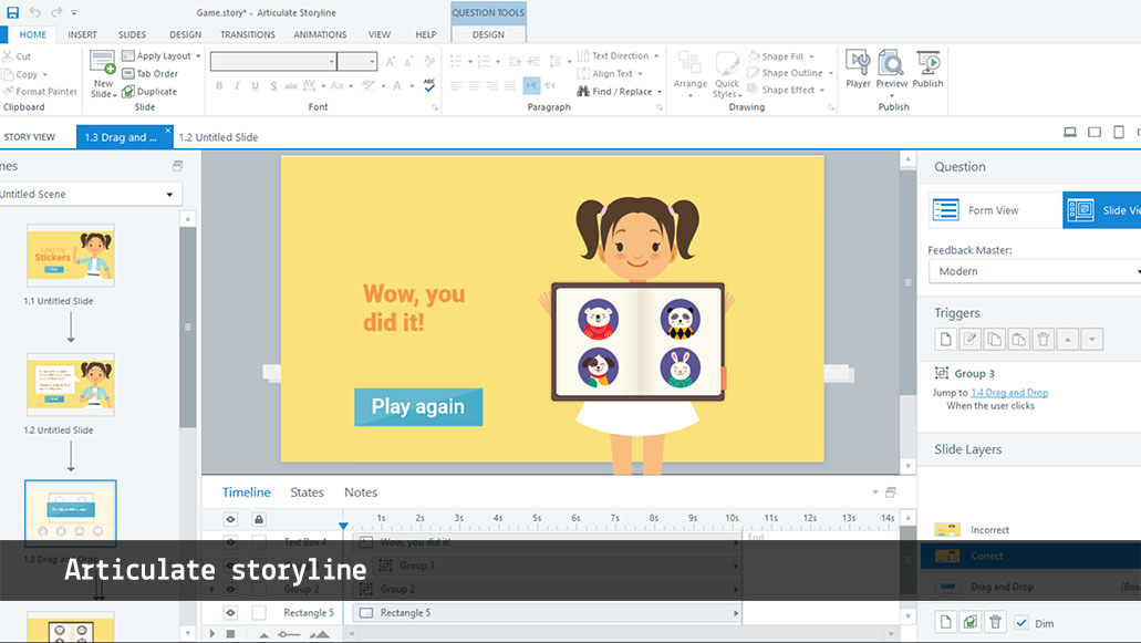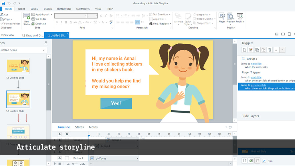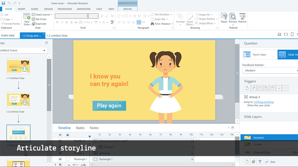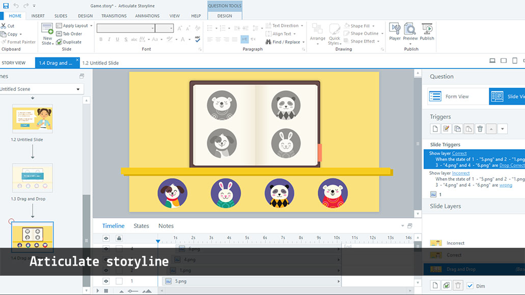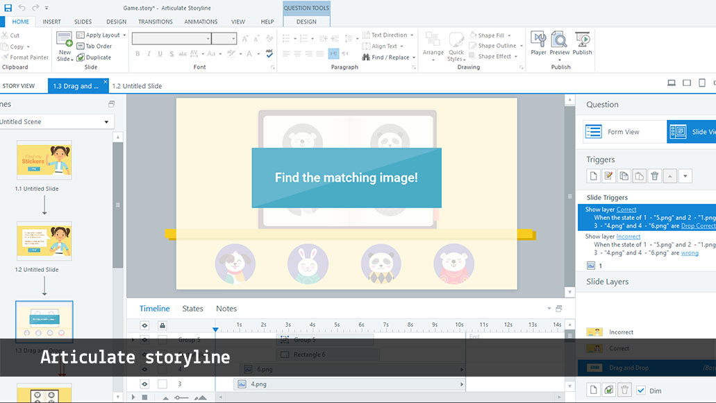 The design of the game is quite simple. I have rote the story of Anna and created a storyboard for the gameplay. After creating the graphics I have used Storyline to program my prototype. The player has to compare the images and drag each one into the correct position. Once all the images have been placed a correct or incorrect feedback would appear on the screen with Anna’s happy or sad face.