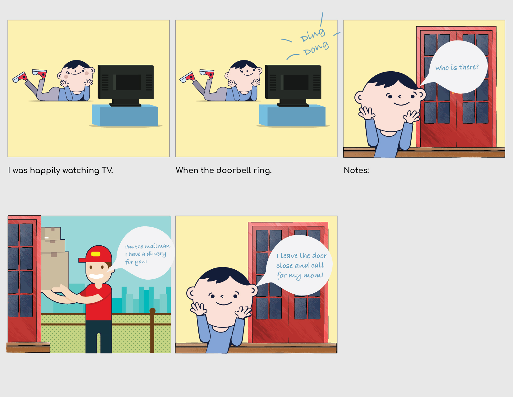 Developing social skills in children equip them for a future normal interaction in all aspects of life. A social story is an easy and efficient method for teaching children how to do specific things, learn social skills, control new or unusual social situations, and manage problem behaviors. So this story intended to teach children to not open the door for strangers. A story about a little boy who heard the doorbell ring, but he kept the door close and called his mother. Social stories teach children what kind of behaviors are expected from them in specific events, as well as the expected responses.